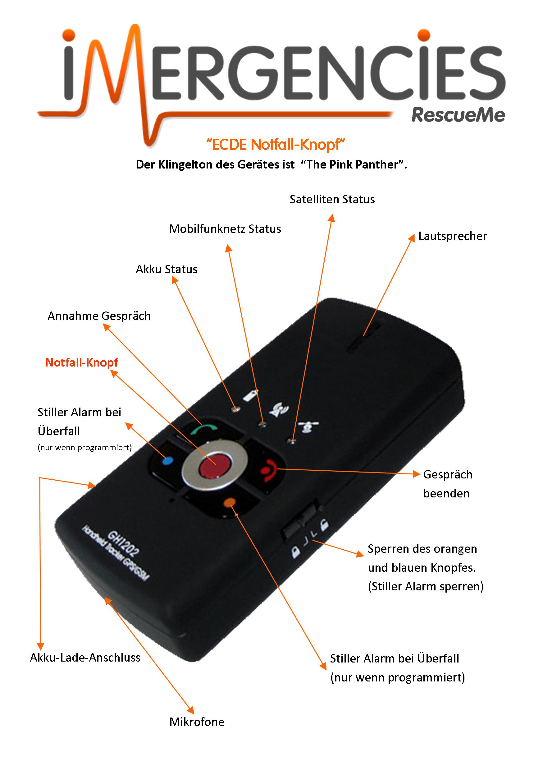 Notfall-Knopf ist eine portable Lösung mit integrierter GPS- und Mobilfunktechnik. Genaue Standortdaten werden über Satellitensignale erfasst und übers Mobilfunknetz übertragen. In medizinischen Notsituationen kann per Knopfdruck Hilfe angefordert werden. Im iMERGENCIES Operation-Center (iOC) wird die exakte Position erfasst, mit der Notrufzentrale 112 Kontakt aufgenommen und die nötigen Schritte in die Wege geleitet.