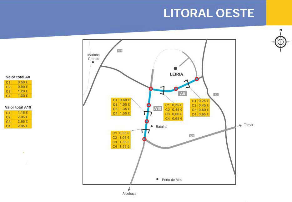 Hier die Karte der Estradas Portugal für die A 8 - die Autoestrada do Oeste und die A 19 - die Variante da Batalha: